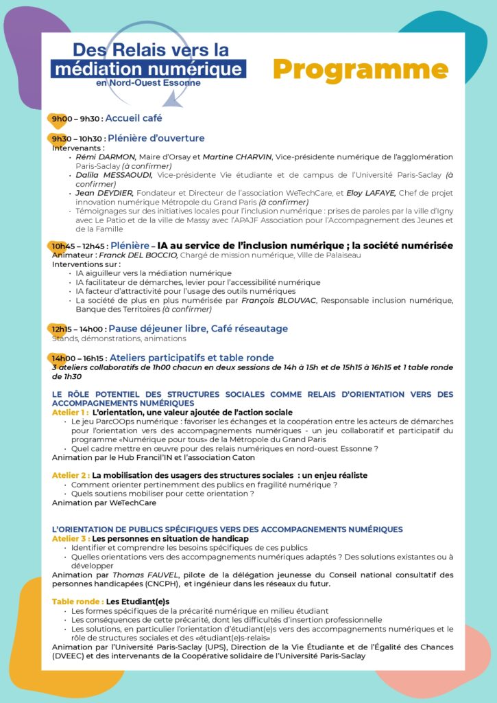 Cette journée d’accès gracieux, que nous organisons avec le soutien de l’ANCT dans le cadre de la feuille de route France Numérique Ensemble de l’Essonne, le Conseil départemental de l’Essonne, la MEIF Paris-Saclay, de l’Université Paris-Saclay, de collectivités et institutions locales, vise à renforcer les coopérations pour répondre au mieux aux sollicitations croissantes pour des aides aux usages des outils numériques ; les structures contribuant à l’action sociale et solidaire, en première ligne face à ces besoins, peuvent avoir un rôle clé pour orienter les publics en fragilité numérique vers les accompagnements les plus appropriés.